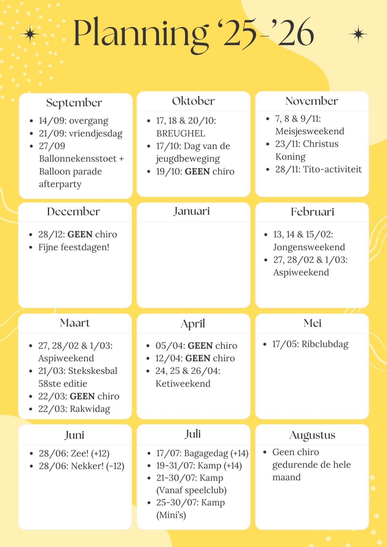 Een nieuw chirojaar, is ook een jaar vol nieuwe activiteiten, evenementen, ... Zet jij alvast volgende datums in je agenda?